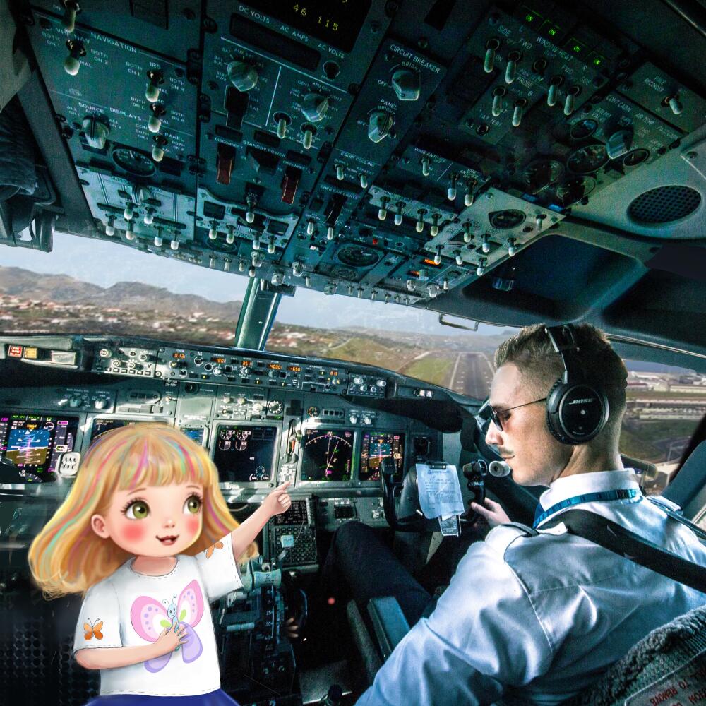 Curious, Mia followed her into the cockpit. Lights blinked, and buttons twinkled like stars.