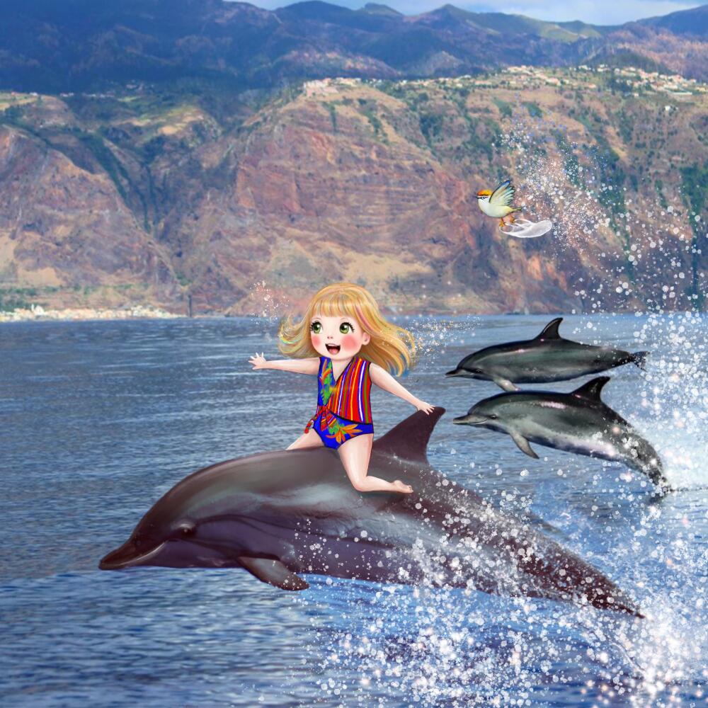 They danced and twirled through the waves—somersaults, splashes, and joy. Little Bird soared above them, laughing in the wind.